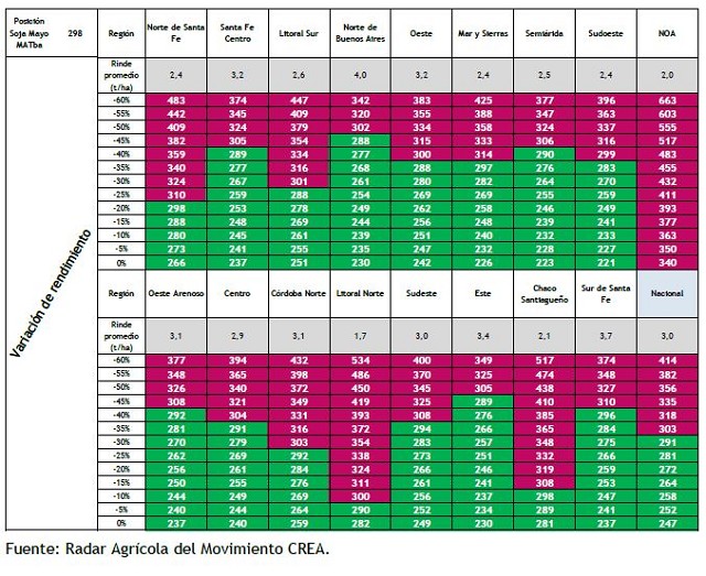 De los resultados surge que, para el cultivo de soja, en el ponderado nacional (Rto promedio de 3 t/ha), con los precios actuales, se podría tolerar una pérdida de rendimiento del hasta el 30%. Las regiones Litoral Norte y Chaco Santiagueño se encontrarían en situaciones muy delicadas, dado que no toleran pérdidas mayores a 5% y 10% de rendimiento, mientras que en el caso de la región de NOA, aun manteniendo los rindes promedios el precio actual no alcanzaría para cubrir los costos. Las regiones que tolerarían mayores mermas de rendimiento son Norte de Buenos Aires y Este.