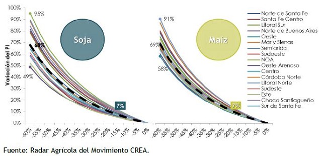 En el caso del cultivo de soja, para la región NOA mermas del 60% aumentan el PI un 95% mientras que para Norte de Buenos Aires ante la misma merma de rendimiento el aumento en el PI es de 49%.