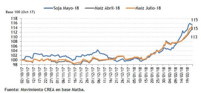 En el caso de la posición maíz abril-2018 del Matba, el precio pasó de 150 USD/t a comienzos de enero a 169,5 USD/t el 17 de febrero, aumentando 13 % en relación a octubre. Para el maíz tardío, la posición del Matba maíz julio-2018 al 2 de enero fue de 145,2 USD/t, en tanto en febrero es de 165,5 USD/t. Una variación respecto a octubre de 15%.