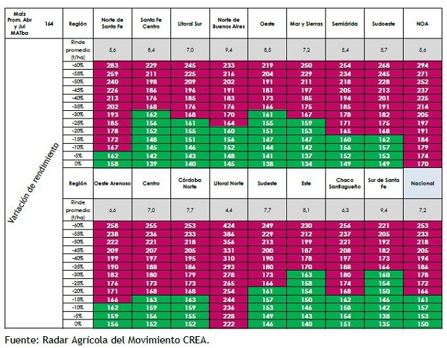 Al igual que para el cultivo de soja, a rendimientos medios, la región de NOA los valores actuales no alcanzan a cubrir el PI. A esta región se suma la región Litoral Norte mientras que la región Norte de Santa Fe tolera apenas 5% de merma. En el extremo de las regiones con mayor tolerancia a mermas de rendimiento se ubican Sur de Santa Fe, Santa Fe Centro y Oeste. Con tolerancias de mermas de hasta 30%.