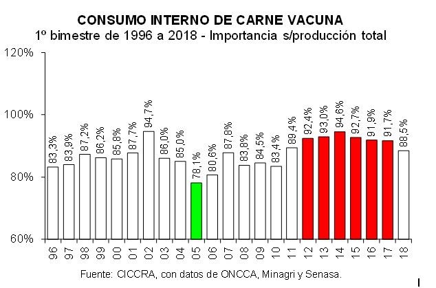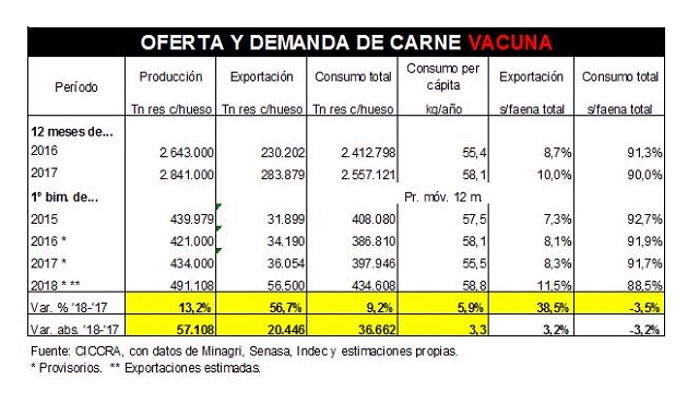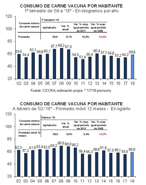 En el informe, CICCRA brinda detalles sobre el consumo per cápita de carne vacuna y explica que este se ubicó en 58,6 kg/año en enero-febrero de 2018. En la misma línea, explica qué en relación a un año atrás se observó una mejora de 8,1%.