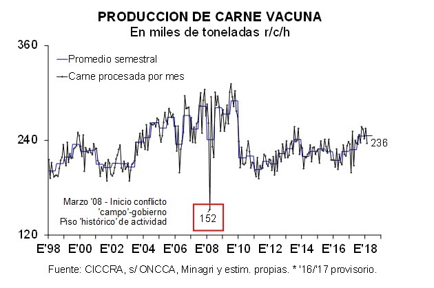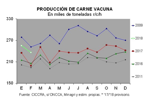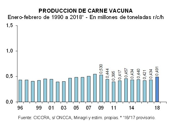 En enero-febrero de 2018 la industria frigorífica produjo 491 mil tn r/c/h de carne vacuna, es decir 13,2% más que en el primer bimestre de 2017. Al realizar la comparación en términos absolutos, los envíos al mercado realizados en lo que va del año superaron en 57,1 mil tn r/c/h a los verificados en enero-febrero del año anterior.