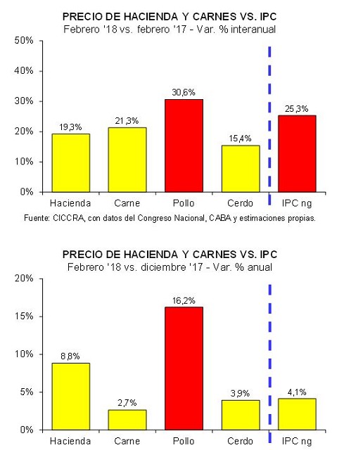 En el caso de la carne aviar, el ajuste de febrero llegó a 12,2% mensual y la suba interanual se elevó a 30,6% (resultando ser también la más alta desde noviembre de 2016). De esta manera, en el segundo mes del año la carne vacuna se abarató significativamente con relación al pollo, tanto en la comparación mensual (-9,4%) como en la comparación interanual (-7,1%).