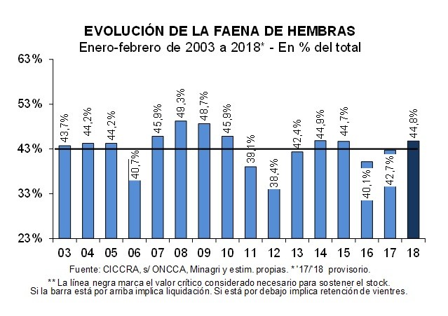 En el primer bimestre del año la industria frigorífica faenó 2,163 millones de cabezas de hacienda vacuna, lo que representó una mejora de 11,8% interanual. A su vez, la participación de las hembras en la faena total fue de 44,8% en enero-febrero de 2018 (guarismo casi idéntico al de enero-febrero de 2015). En relación al primer bimestre de 2017 este cociente creció 2,1 puntos porcentuales.