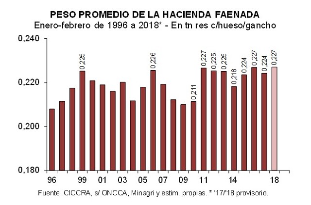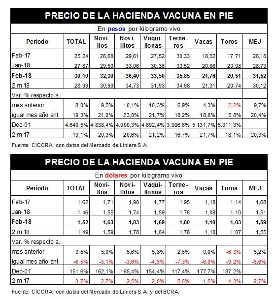 Como ocurre siempre que se ajusta el tipo de cambio peso/dólar, el valor promedio de la hacienda en pie reacciona de manera gradual (es decir, no inmediata), dando lugar a una caída del valor del animal en dólares estadounidenses. En febrero de 2018 la cotización del dólar en pesos argentinos subió 4,3% mensual y acumuló una suba de 12,3% desde septiembre del año pasado. En este período, el precio de la hacienda en pie pasó de US$ 1,681 por kilo vivo a US$ 1,515, exhibiendo una caída de 9,9% entre puntas de los cinco meses.