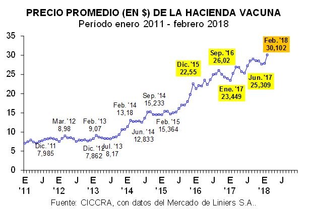 En relación a febrero, el precio de la hacienda en pie comercializada en el Mercado de Liniers subió fuerte, luego de la pausa que había registrado entre septiembre y enero. El precio promedio subió 8,0% en relación a enero y se ubicó en $ 30,102 por kilo vivo.