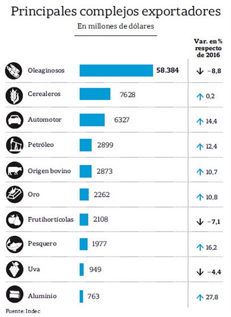 La marcha de los complejos exportadores tienen especial importancia para la Argentina en la situación actual, debido a que la balanza comercial es altamente deficitaria. En 2017 cerró con un déficit récord de US$8471 millones, en contraste con el superávit de US$1969 millones de 2016 y en el marco de un crecimiento de las importaciones (19,7%).