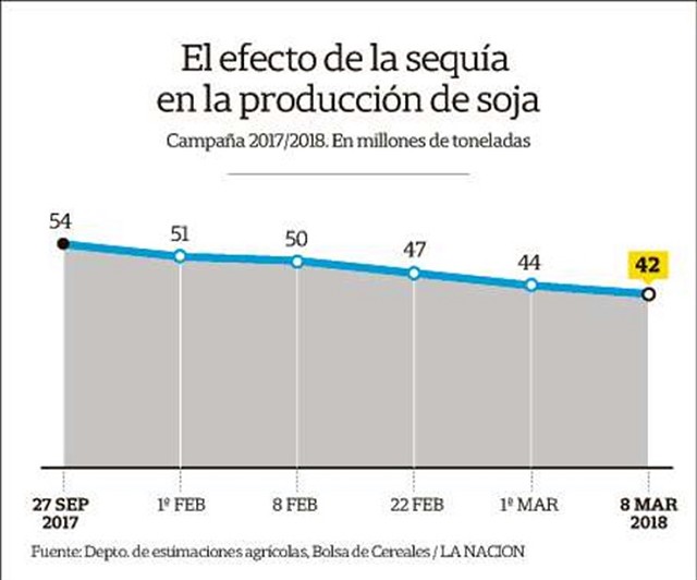 Como en un tobogán, las proyecciones para las cosechas de soja y maíz de la Argentina siguen cuesta abajo. Ayer, la Bolsa de Cereales de Buenos Aires volvió a recortar su previsión de cosecha de soja, esta vez en dos millones de toneladas, y dejó el volumen estimado en 42 millones de toneladas. Se trata de 12 millones menos respecto de lo que esperaba días antes del inicio de la siembra, en septiembre pasado, y una pérdida directa para los productores por el menor volumen de unos US$3600 millones. En soja, sería la menor cosecha en seis campañas, incluyendo a la actual, ya que en 2011/2012 se produjeron según la entidad 39,9 millones de toneladas.