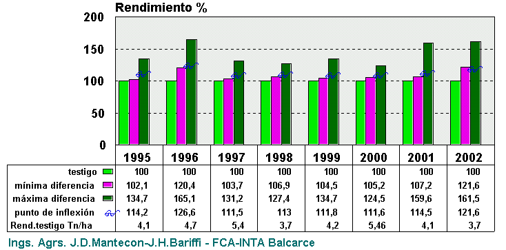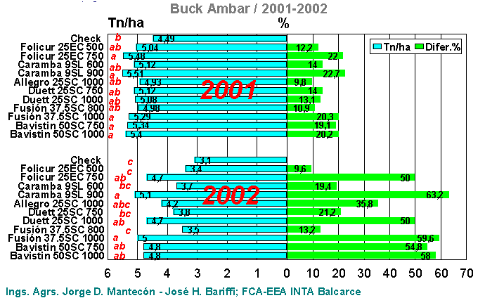 Los resultados que se presentan corresponden a las temporadas 2001 y 2002. Es mi intención destacar que las condiciones ambientales para esta enfermedad fueron un poco más favorables en la temporada 2002 que en la 2001.