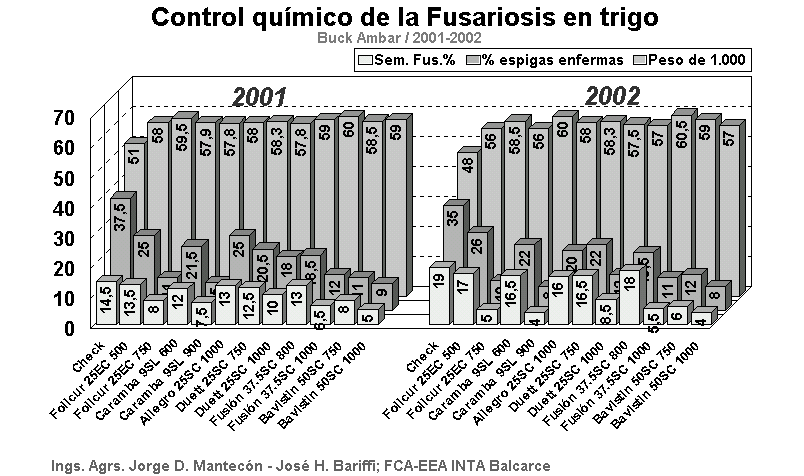 Durante la campaña pasada la incidencia de enfermedades foliares, fundamentalmente Septoriosis (Septoria tritici)y en menor medida roya anaranjada (Puccinia recondita)fue muy importante en algunos cultivares. Resultados de ensayos de control mostraron importante diferencias entre pulverizar con fungicida un cultivo y no hacerlo; principalmente en aquellos cultivares que luego de un monitoreo constante, mostraron la necesidad de recurrir a una técnica de control químico.