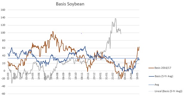 Por otro lado, las bases argentinas se debilitaron desde los máximos, dicho en otras palabras, la diferencia Chicago-MATBA se agrandó. Como observamos en el grafico a continuación, la línea gris muestra los basis de soja de la campaña en curso, y si bien bajaron desde los máximos, las basis a esta altura del año para soja Mayo son las mayores de los últimos años.