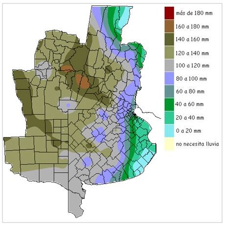 Este mapa permite cuantificar la demanda y cruzarla con los pronósticos para visualizar su potencial nivel de satisfacción. Si nos paramos por ejemplo en el centro de la zona núcleo, vemos que los acumulados requeridos para que las reservas crezcan hasta valores adecuados están por encima de los 120 milímetros.