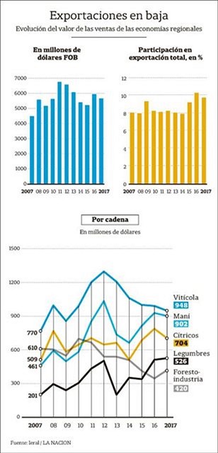 Los volúmenes que exportaron las economías regionales el año pasado, en promedio, fueron similares a los de 11 años atrás. Los autores del informe indican que aunque desde la asunción de Cambiemos se tomaron medidas y se generaron mejores expectativas de exportación, ese contexto no se cristalizó en más operaciones efectivas y tampoco se está frente al inicio de un ciclo de recuperación y expansión.