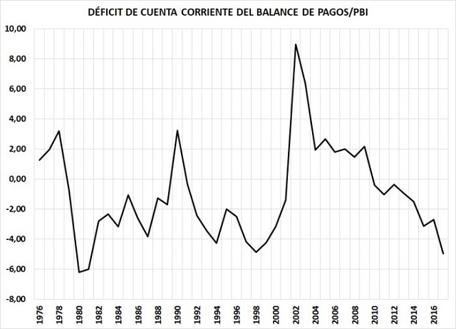 Recordemos que la cuenta corriente incluye el saldo de balance comercial, el neto de turismo, de utilidades y dividendos, transferencias unilaterales e intereses de la deuda externa. En la medida que el tipo de cambio cae en términos reales por el arbitraje tasa versus dólar y el estado toma más deuda y, consecuentemente, tiene que pagar más intereses de la deuda externa, el déficit de la cuenta corriente del balance de pagos tiende a crecer.