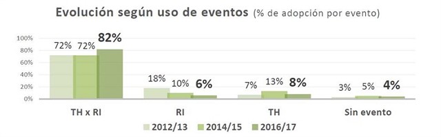 Los híbridos con eventos apilados (TH x RI), es decir, con evento tolerante a herbicidas (TH) y con uno o más eventos resistentes a insectos (RI) alcanzaron el 82% de adopción a nivel país, mientras que materiales simples TH y RI disminuyeron a un 8% y 6% respectivamente. Los materiales sin evento durante los últimos años vienen presentando poca variación en su uso, que fue del 4% durante la campaña 2016/17.