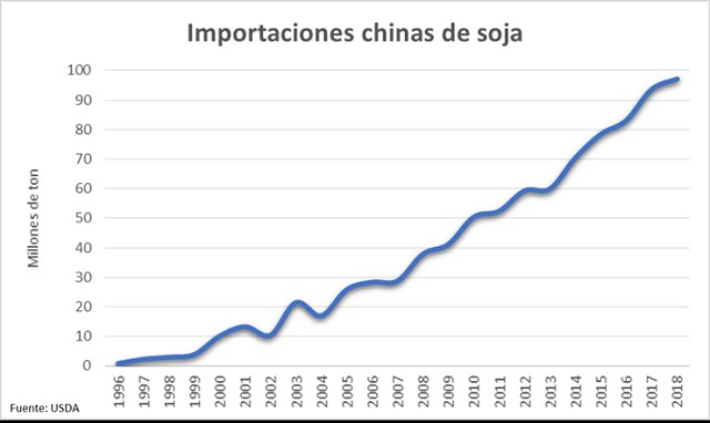 Los potenciales aranceles adicionales a la soja aumentan la dependencia china hacia los restantes y escasos proveedores del mercado, ya que solo puede producir localmente un 10% de su consumo interno. La imparable demanda china ha disparado exponencialmente las importaciones de soja durante los últimos 20 años.