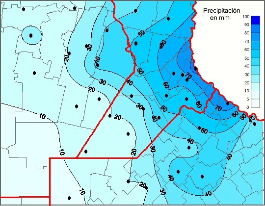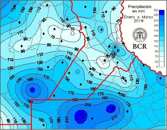 Una importante disparidad de datos se registró al sudeste de Córdoba, desde 12 mm en Canals a 43 mm en Monte Buey. Noetinger marcó 42 mm, Belville 25,6 mm, Colonia Almada 17,5 mm.