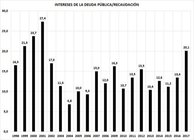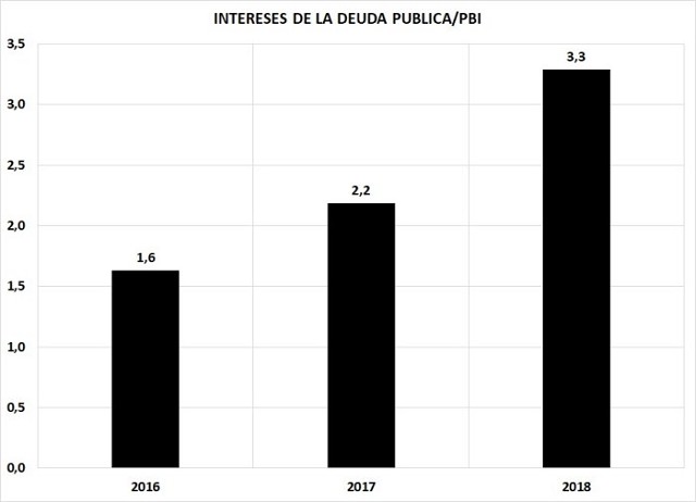De acuerdo al presupuesto, en 2018 los intereses de la deuda representarán el 3,3% del PBI, es decir 1,1 puntos más que en 2017. Si van a bajar el déficit primario en 1 punto, quiere decir que el déficit financiero no bajará sino que subirá o se mantendrá y el gradualismo empeorará la situación fiscal en vez de solucionarla.