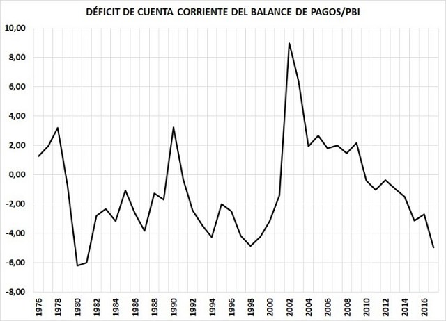 Si el tipo de cambio se mantiene artificialmente bajo, los problemas de déficit de cuenta corriente pueden seguir empeorando. Como puede verse en el gráfico 3, ya estamos en una relación déficit de la cuenta corriente del balance de pagos/PBI del 5%.