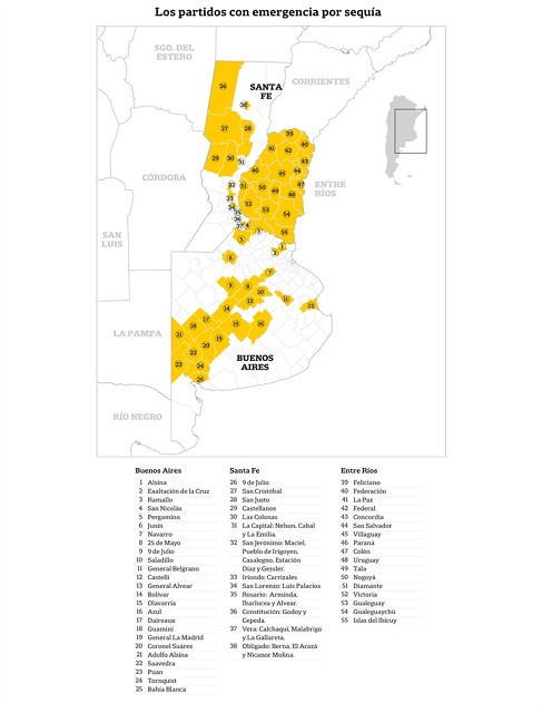 Santa Fe, por ejemplo, ya declaró la emergencia para más de 5,8 millones de hectáreas y falta la homologación nacional. En el caso de Buenos Aires, la comisión de emergencia provincial declaró la emergencia para 27 municipios, que involucran 3,5 millones de hectáreas, y ahora resta la firma de la gobernadora María Eugenia Vidal.