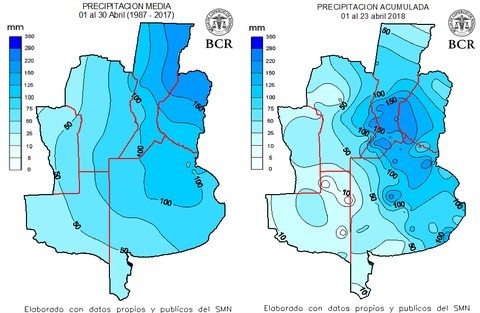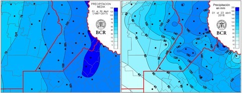 Durante el domingo 22 y lunes 23 de abril, el temporal dejó acumulados de 20 a 60 mm en el 75% de la región núcleo. Estas se suman a las importantes lluvias del viernes pasado, unos 30 a 50 mm, que alcanzaron el 60% del área. La distribución del agua ha sido diferente en ambos episodios y se han complementado, distribuyendo el agua con más ecuanimidad.