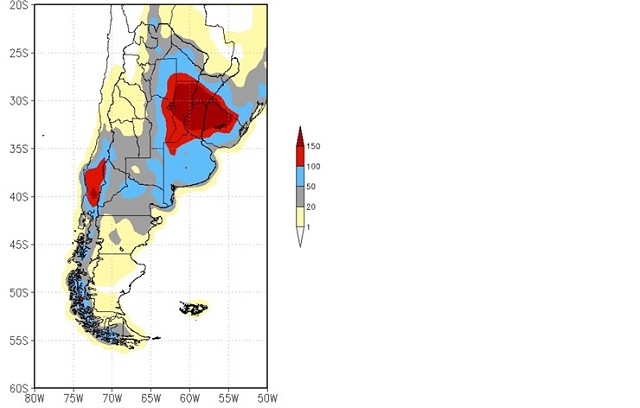 "En los próximos siete días se prevén acumulados del orden de 100 mm en el norte de Buenos Aires, este de Córdoba, Santa Fe, Entre Ríos, sur de Chaco y sur de Corrientes", señaló el informe oficial.
