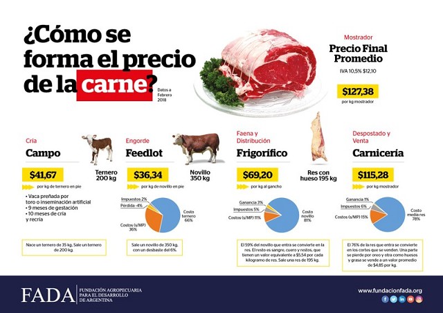 Del precio promedio de la carne de $127,38 por kilogramo, el ternero forma el 38% del precio final ($48,47), el feedlot el 19,4% ($23,34), el frigorífico el 9,7% ($12,36), la carnicería el 14,5% ($18,47) y los impuestos el 19,4% ($24,75).