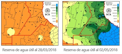 Ya van dos semanas consecutivas de precipitaciones que promueven la recuperación y recarga de los perfiles de los suelos, tras la peor sequía de los últimos 50 años. Las lluvias, que se venían conteniendo durante cinco meses, han vuelto a instalarse en el mes de abril y en los primeros días de mayo. El noreste bonaerense pasó de tener una condición de escasa humedad y sequía a tener excesos de agua. Sin embrago, el sudoeste cordobés y el extremo noroeste de Buenos Aires todavía presentan reservas de regulares a escasas. Allí, se necesitarían lluvias de 40 a 80 mm para restablecer condiciones de humedad óptimas.