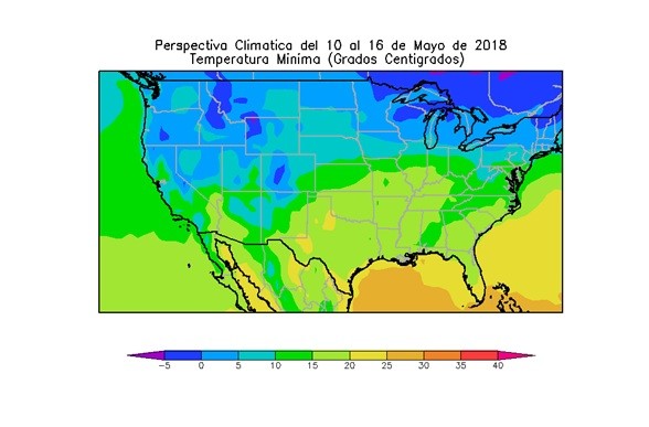 - La mayor parte de Dakota del Sur, de Nebraska y el centro del cinturón maicero, observarán temperaturas mínimas entre 5 y 10ºC.