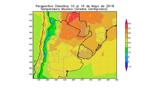 - El este del NOA, el norte de Cuyo, la mayor parte de la Mesopotamia, el norte de Santa Fe, el noroeste y el sur de Entre Ríos, el extremo sudeste del Paraguay y la mayor parte de la República Oriental del Uruguay, observarán temperaturas máxima superiores a 25°C, con focos superiores a 30 y 35°C hacia el norte.