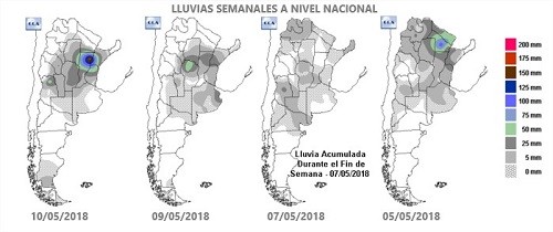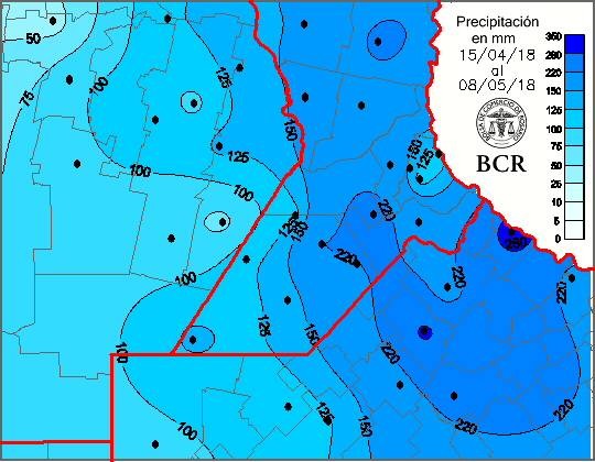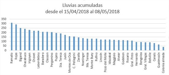 Desde mediados de abril las incesantes lluvias han dejado acumulados de 100 a 300 mm en el 60% de la región núcleo. Del 15 de abril al 8 de mayo Ramallo recibió 308 mm. Le sigue Rojas con 291 mm, tambien en el noreste bonaerense, que sufrió lluvias que van de los 220 mm a los 280mm.