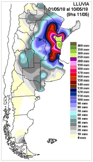 Desde el punto de vista del comportamiento de las lluvias y como acabamos de ver, la transición intermensual apenas si modificó las condiciones meteorológicas, en todo caso potenció el escenario para el desarrollo de sistemas precipitantes. Como resultado, los primeros diez días de mayo siguieron sobre ofertando con agua a gran parte de la región pampeana, en realidad a gran parte del país. Si hoy se estuviese cerrando el mes de mayo, el mapa de apartamientos pluviales respecto de los valores estadísticos, mostraría un vasto desvío positivo, que sólo encuentra excepciones en el sudeste de BA, el extremo noreste de Corrientes y la provincia de Misiones. Es decir, faltando casi tres semanas para completar el mes, los acumulados normales mayoritariamente ya se han completado, con el centro este de la región pampeana y el centro del litoral con acumulados que en muchos casos han sido record para el mes de mayo. La improbable anomalía pluvial no solo apareció, sino que superó todas las expectativas y cambio el signo de los problemas.