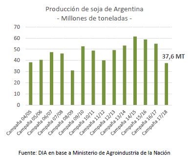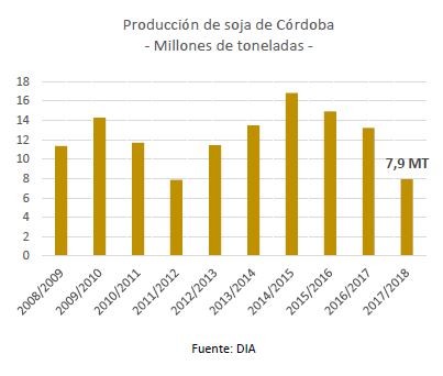 La campaña estival 2017/18 estuvo marcada por una de las sequías mas severas que ha afectado a las principales zonas agrícolas del país, repercutiendo en pérdida de área y menores rendimientos. Por otra parte, se produjeron importantes precipitaciones al momento de la cosecha generando complicaciones logísticas y afectando la calidad del grano. De esta manera, la producción de soja en Argentina alcanzaría un volumen de producción de 37,6 millones de toneladas, cayendo un 32% respecto al ciclo pasado y alcanzando el valor más bajo de las últimas nueve campañas. En la provincia de Córdoba, de acuerdo con datos del