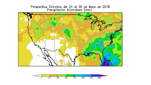 La perspectiva comenzará con precipitaciones irregulares de muy variada intensidad que se extenderán sobre la mayor parte del área agrícola norteamericana y siendo escasas sobre el sudoeste de esta. Paralelamente, avanzarán los vientos polares, provocando temperaturas por debajo de lo normal para la época. Hacia mediados de la perspectiva los vientos del sur retornarán rápidamente, produciendo un marcado ascenso térmico, con valores superiores a lo normal sobre la mayor parte del área agrícola norteamericana. Este proceso será acompañado por varios de fenómenos extemporáneos: Lluvias intensas en partes del sudeste, el sur de los Apalaches, el Valle Inferior del Misisipi, las Llanuras meridionales y el valle de Tennessee.25-26 de Mayo; Es posible que haya inundaciones en partes del Atlántico Medio, el Noroeste del Pacífico y el Valle Superior del Misisipi; Inminentes inundaciones en partes de las Planicies del Norte, las Montañas Rocosas del Norte y la Gran Cuenca del Norte; Sequía severa a través de las Planicies Centrales, la Gran Cuenca Central, las Planicies del Norte, California, el Sudeste, las Planicies del Sur y el Suroeste.