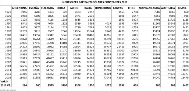 Solo con ver algunos datos de Angus Maddison, podemos observar cómo Argentina pasó de ser un país desarrollado a un país subdesarrollado. Países que mirábamos por encima del hombre como si fuésemos unos fenómenos, nos pasaron como poste caído en los últimos 70 años e inclusive en menos de 70 años.