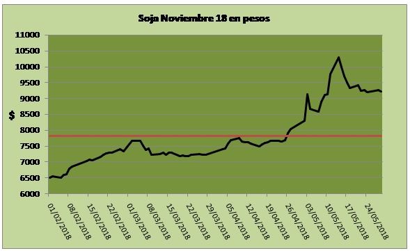 Combinando esta tendencia favorable de mediano plazo, con tasas superiores al 30% en términos anuales para el dólar noviembre en Rofex, nos obliga a poner el foco en el valor en pesos que podemos obtener por soja noviembre.