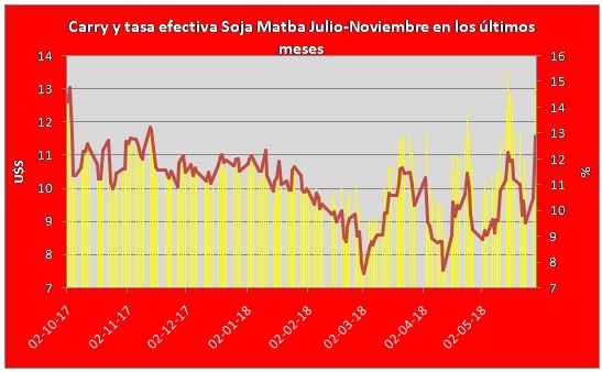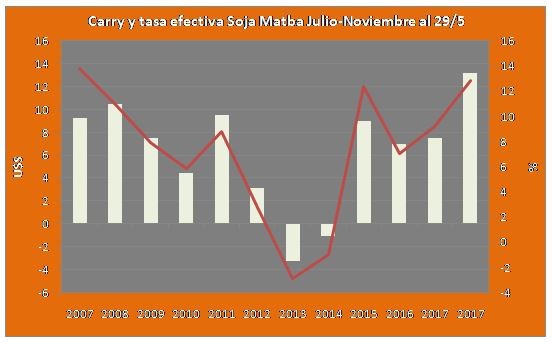 En este sentido, y tal como lo refleja el gráfico 1 a través de las barras y eje izquierdo, el diferencial julio-noviembre se ubica en máximos históricos para finales de mayo superiores a U$S 13. Esto tiene asociado una atractiva tasa en dólares de prácticamente 13% (línea roja y eje derecho), alcanzando su mayor nivel en términos estacionales desde 2007.
