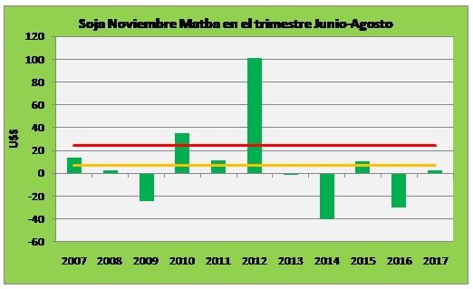 Mirando hacia adelante, para los que tengan interés en negociar sus stocks de soja en unos meses apostando a números más ajustados en la nueva campaña en EEUU, deben saber que entre 31/5 y 31/8 (para ese momento ya se definieron los rindes en el primer productor mundial) la posición noviembre en Matba ha exhibido un comportamiento moderadamente alcista en las últimas 11 temporadas.