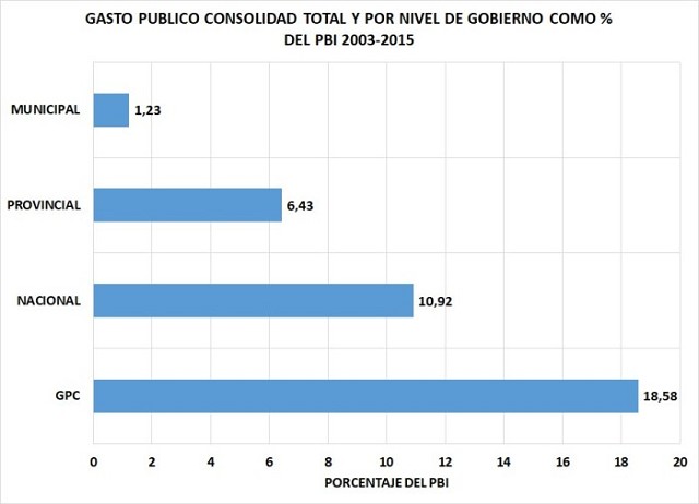 La herencia de la era k muestra que el gasto público consolidado aumentó 18,58% del PBI. El mayor aumento se dio en el nivel nacional, luego el provincial y finalmente el municipal.