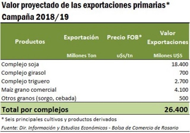 Por lo que ante este contexto, estiman que los seis cultivos principales (soja, maíz, girasol, trigo, cebada y sorgo) podrían generar un ingreso de divisas al país por exportaciones que podría ubicarse en los U$$ 26.400 millones.