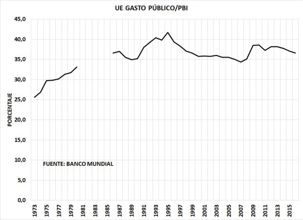 El gráfico 1 muestra la evolución del gasto público/PBI en la UE. Claramente ha crecido de 25 puntos del PBI desde inicios de los 70, para mantenerse en el rango de 35 a 40 por ciento del PBI actualmente. Tomando este dato, pueden suponer que el problema no está en el nivel de gasto sino en la forma en que se gasta.