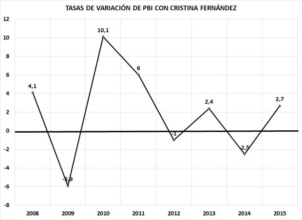 En los años de mandato de Cristina Fernández, el gasto público consolidado pasa del 34% del PBI al 46%. 12 puntos de aumento del gasto público récord se generaron en los gobiernos del vamos por todo. ¿Qué pasó con el nivel de actividad? Veamos el gráfico 6. La economía se mantuvo casi estancada con fuertes variaciones y tres años de recesión. Semejante incremento del gasto público no produjo en absoluto un aumento de la actividad económica. Directamente la ahogó y dejó un tendal de pobreza, inflación, cepo cambiario y déficit fiscal.