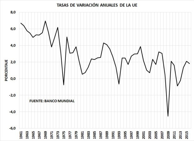¿Pero qué ocurrió con el crecimiento de la UE a medida que iba aumentando el gasto público/PBI? Claramente las tasas de crecimiento fueron bajando como lo refleja el gráfico 2. Una clarísima tendencia decreciente en las tasas de aumento del PBI hubo en la UE en los últimos 55 años hasta llegar a niveles de estancamiento.