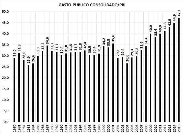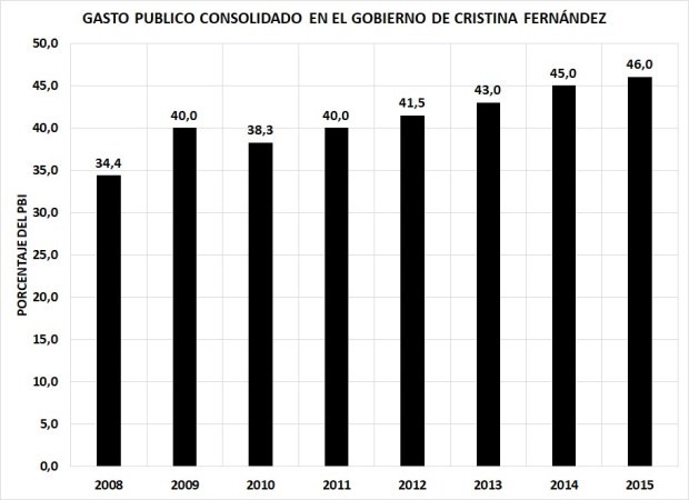 Tomando los últimos 35 años, vemos un gasto público consolidad del orden del 30% del PBI que se acelerar en la era kirchnerista, en particular con Cristina Fernández. La ex presidente llevó el nivel de gasto público consolidado a niveles récord haciendo que el peso del estado sobre el sector privado sea tan intolerable que la economía se mantenga estancada.