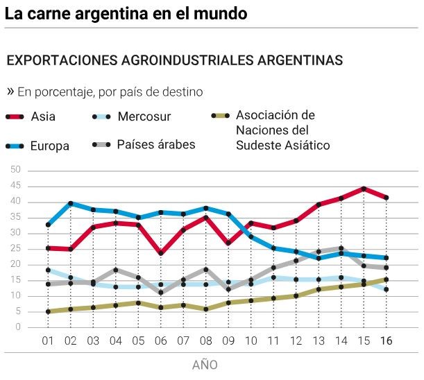Estos cambios globales ya se manifiestan en las exportaciones agroindustriales argentinas, (ver infografía), donde se ve claramente como cambió el destino, crecen Asia y la ASEAN su subcomponente más dinámico, los países árabes y cae fuertemente la Unión Europea, que fue el 50 % hasta los 90 y hoy menos del 25%.