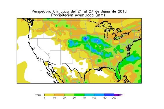 La perspectiva comenzará con precipitaciones de muy variada intensidad sobre gran parte del área agrícola norteamericana. Posteriormente, arribará una masa de aire frío, que provocará un descenso térmico algo por debajo de lo normal para la época. Los vientos del trópico retornarán rápidamente, causando un marcado ascenso térmico, con registros superiores a la media estacional, en la mayor parte del área agrícola norteamericana. La evolución del clima mostrará una sucesión de riesgos: Lluvias intensas en partes de los Grandes Lagos, el Valle Medio del Misisipi, el Valle de Ohio y las Planicies del Sur. 22 al 25 de Junio; Excesivo calor en partes del Sudeste: .22 al 26 de Junio; Sequía severa a través de las Planicies Centrales, las Montañas Rocosas Centrales, la Gran Cuenca Central, las Planicies del Norte, la Gran Cuenca del Norte, las Montañas Rocosas del Sur, el Valle Medio del Misisipí, California, las Planicies del Sur y el Suroeste.