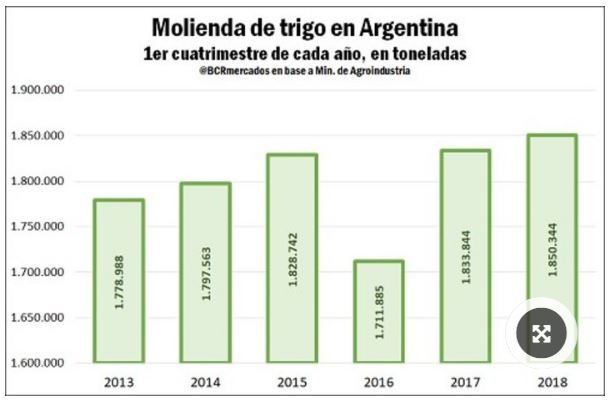 La molienda de trigo acumulada en los meses enero-abril de 2018 en Argentina suma 1,85 millones de toneladas, el registro más alto desde el primer cuatrimestre del año 2012, según consignó la Bolsa de Comercio en base a información del Ministerio de Agroindustria. Y para este año hay mejores perspectivas para el trigo ya que se espera una superficie récord con más de 6 millones de hectáreas a nivel país.