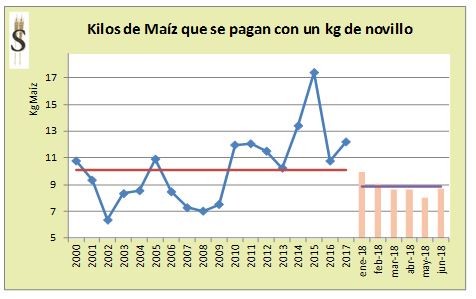 un kilo de novillo se adquirían 17,4 kilos de maíz. Durante 2016 la relación cae