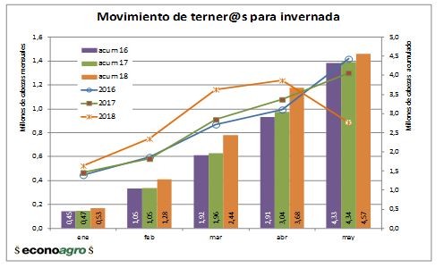 Durante 2018, y como consecuencia de la importantísima seca ocurrida en gran parte del país, el movimiento de terner@s en lo que va del año, ha tenido un comportamiento diferente al de otras zafras. Tal como se muestra en el grafico adjunto, ya durante febrero se aceleró el movimiento de terner@s con destino a invernada, A fines de marzo del 2018 se habían movido casi un 40% más que el promedio de las últimas 5 campañas (2013 a 2017). La diferencia se siguió marcando hasta abril inclusive y recién cae a partir de mayo.
