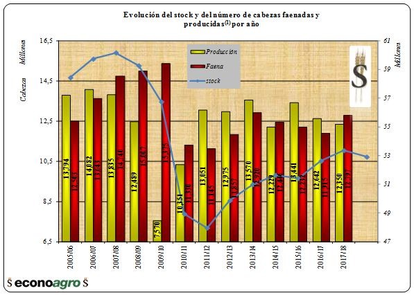 La producción de cabezas crece de manera conjunta con la cantidad de cabezas faenadas desde 2003 hasta 2006. Mientras la producción sea mayor a la faena (columnas amarillas mayores a las rojas), el stock de hacienda del siguiente ejercicio será mayor. Durante 2007 comienza un significativo aumento de la faena, lo que hace que la producción de carne comience a caer, y como consecuencia directa el stock de hacienda se contrae. El pico máximo de la faena se produce durante 2009, y fue tan grande la cantidad de cabezas faenadas, que se produce a fines de ese mismo año un efecto rebote en el precio.